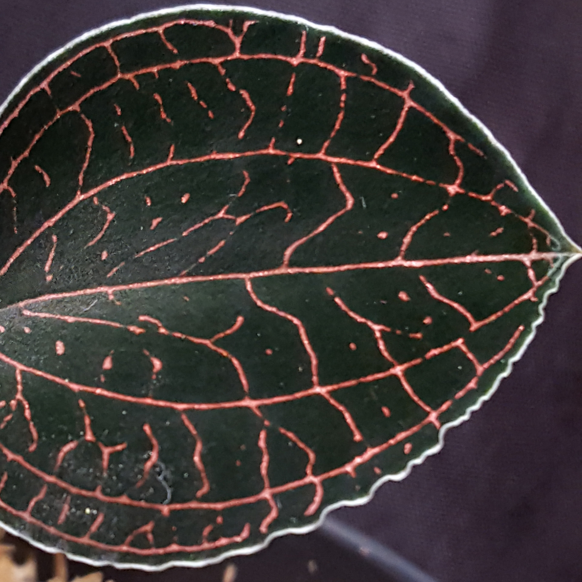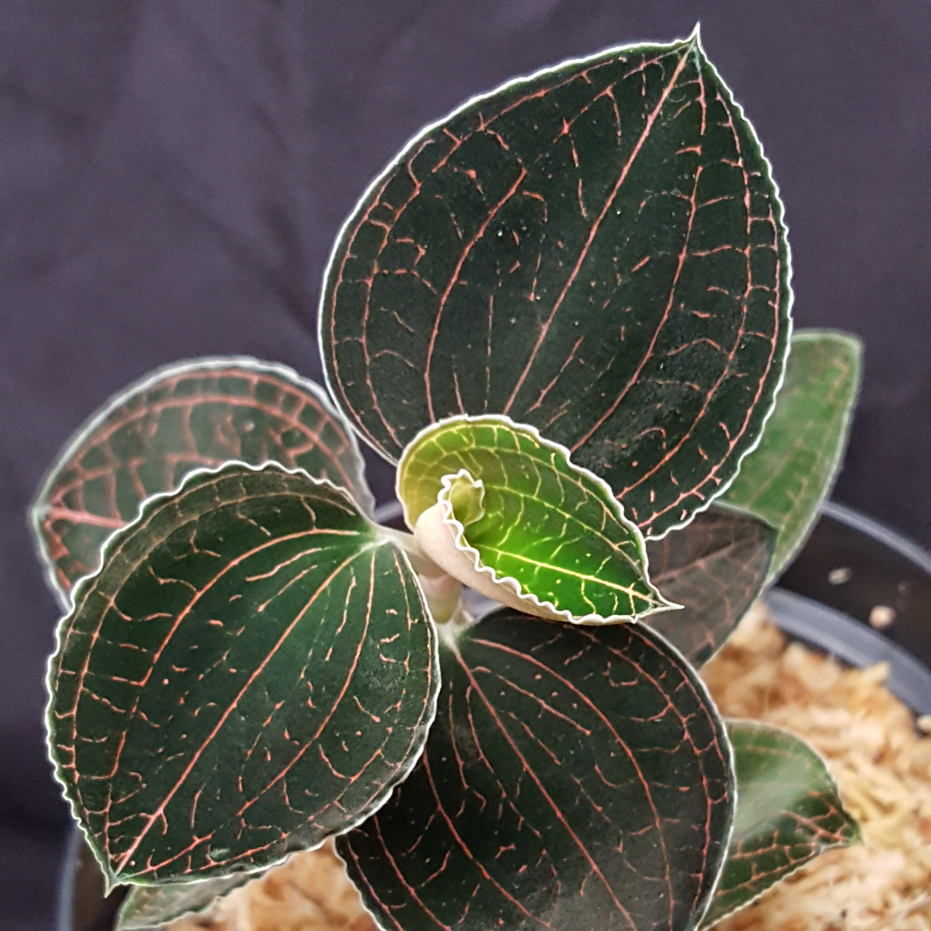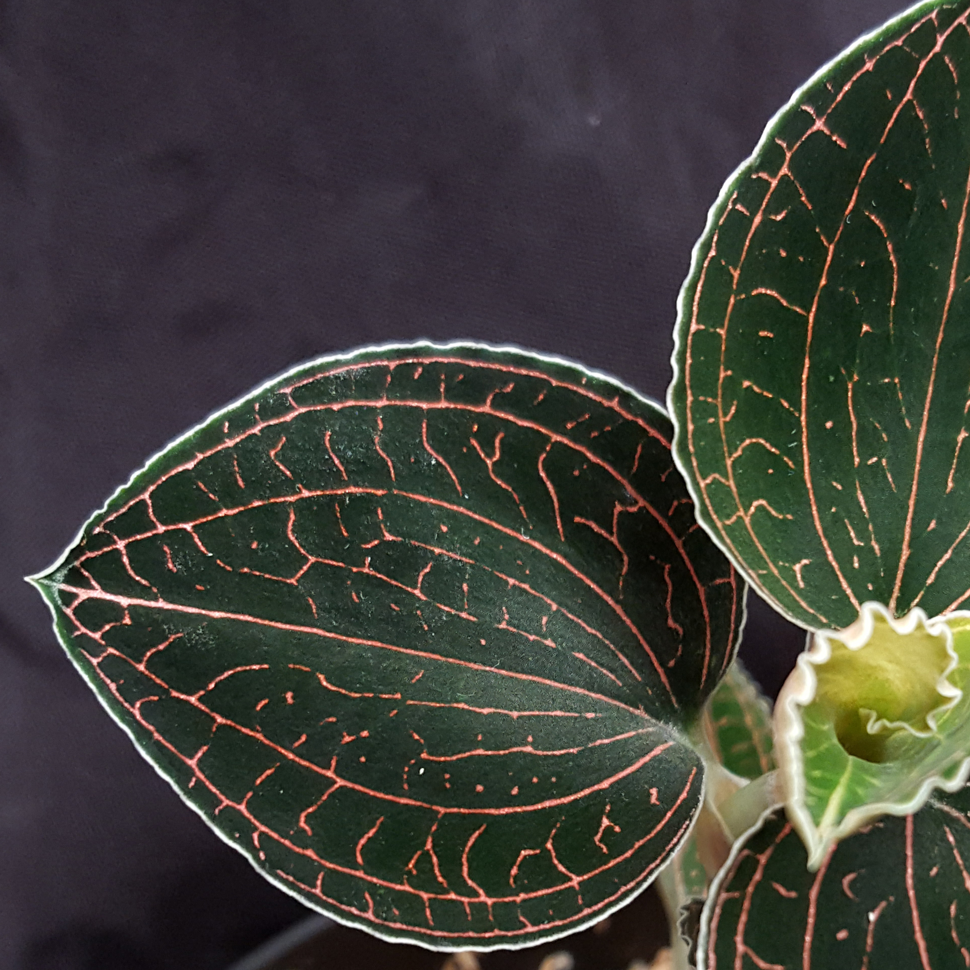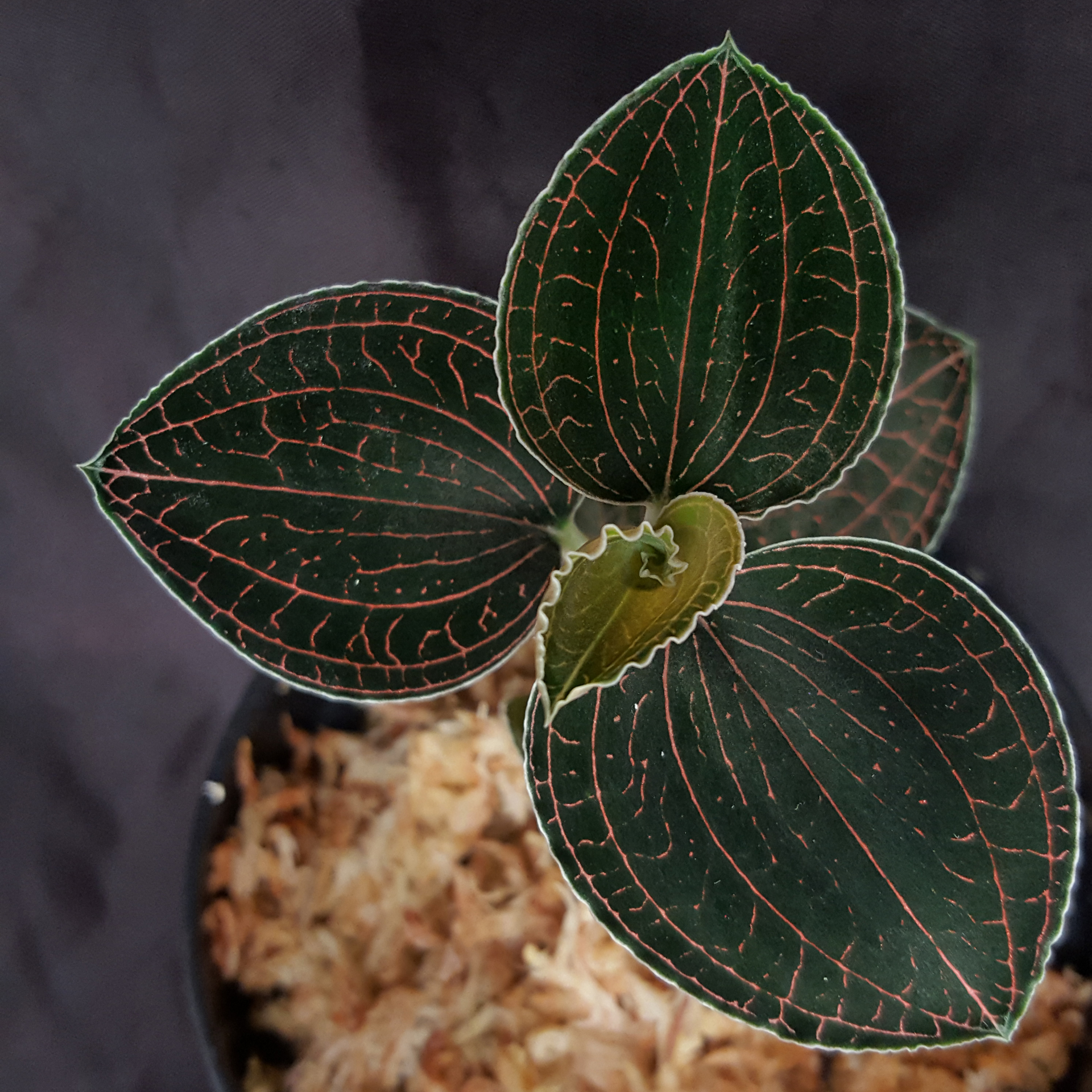 Feurig-rötliche Blattadern durchziehen die dunklen, nahezu schwarzen Blätter der kleinwüchsigen Anoectochilus brevilabris 'White Veil' Lindl. 1840 und bilden so einen herrlich-schönen Kontrast. Sie kommt im östlichen Himalaya, in Bhutan, in Indien und in Assam vor. Diese asiatische Juwelorchidee fühlt sich meiner Erfahrung nach bei den Temperaturen wohl, bei denen auch Sie sich wohl fühlen. Sie gedeiht im Schatten der Wälder auf dem Boden und ist daher bestens an geringere Lichtverhältnisse angepasst. Direkte Sonne schadet ihr und führt zu Schädigung der Blätter. Die Wurzeln müssen in einem gut belüfteten, stets feuchten Substrat wachsen, zum Beispiel fingerfeuchtes, nicht verdichtetes Sphagnum Moos. Staunässe bringt sie mit hoher Wahrscheinlichkeit um, da dann die Wurzeln keine Luft mehr bekommen. Auch mit dem Düngen bitte sparsam sein und falls möglich nur Regenwasser zum Gießen verwenden. Die gezeigten Bilder sind beispielhaft, die Pflanze die Sie erwerben ähnelt den Abbildungen.