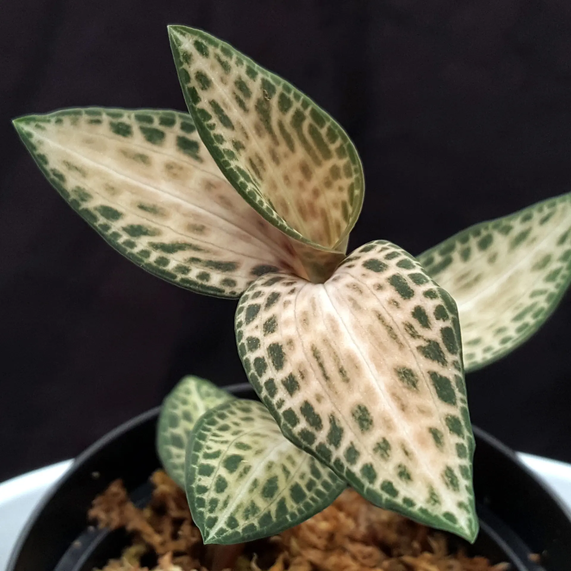 Ein echter Hingucker ist die Juwelorchidee Goodyera schlechtendaliana 'Cherry Blossom' Rchb. f. 1850. Die herrlich gezeichneten weiß-grünen Blätter sind mit einem Hauch Rosa überzogen, was diesen Juwelorchideen ein einzigartiges Aussehen verleiht. Diese Panaschierung ist sonst nur selten zu finden und wurde in Japan isoliert. Ein wenig erinnert die Färbung der Blätter an die japanische Kirschblüte. Die Stammform Goodyera schlechtendaliana zeigt ein weites Verbreitungsgebiet in Südostasien, dementsprechend anpassungsfähig ist diese Juwelorchidee. Sie ist meiner Erfahrung nach allerdings eher im temperiert bis kühlen Bereich zu halten - allzu hohe Temperaturen würde ich auf Dauer vermeiden. Auch sie mag ein lockereres, feuchtes Substrat, Staunässe bekommt ihr nicht und führt zum Untergang der Pflanze. Direkte Sonne bitte vermeiden, da ansonsten das wenige vorhandene Blattgrün ausbleicht. Die gezeigten Bilder sind beispielhaft, die Pflanze die Sie erwerben ähnelt den Abbildungen.
