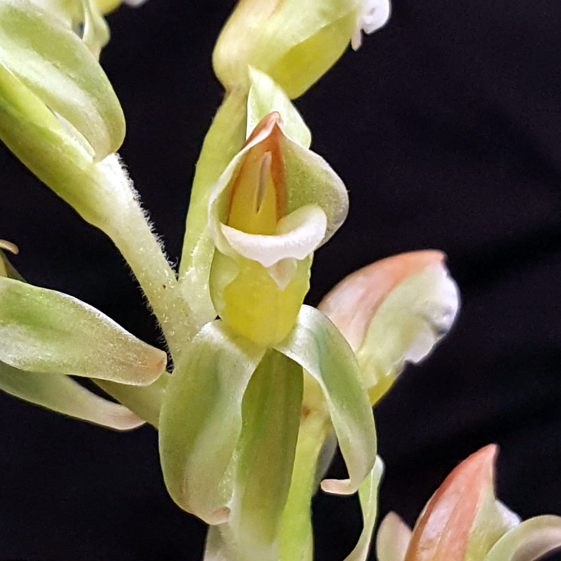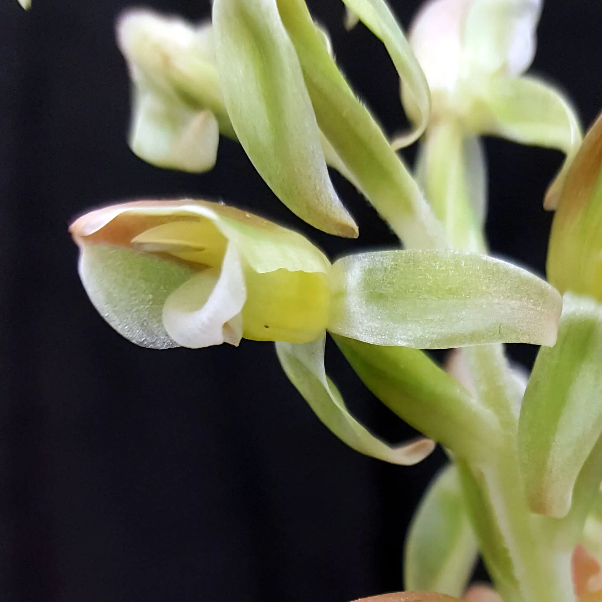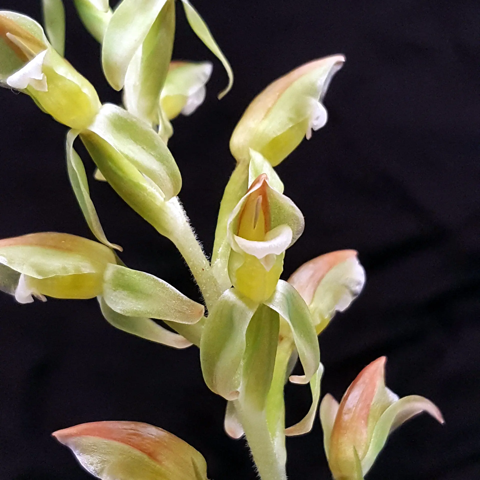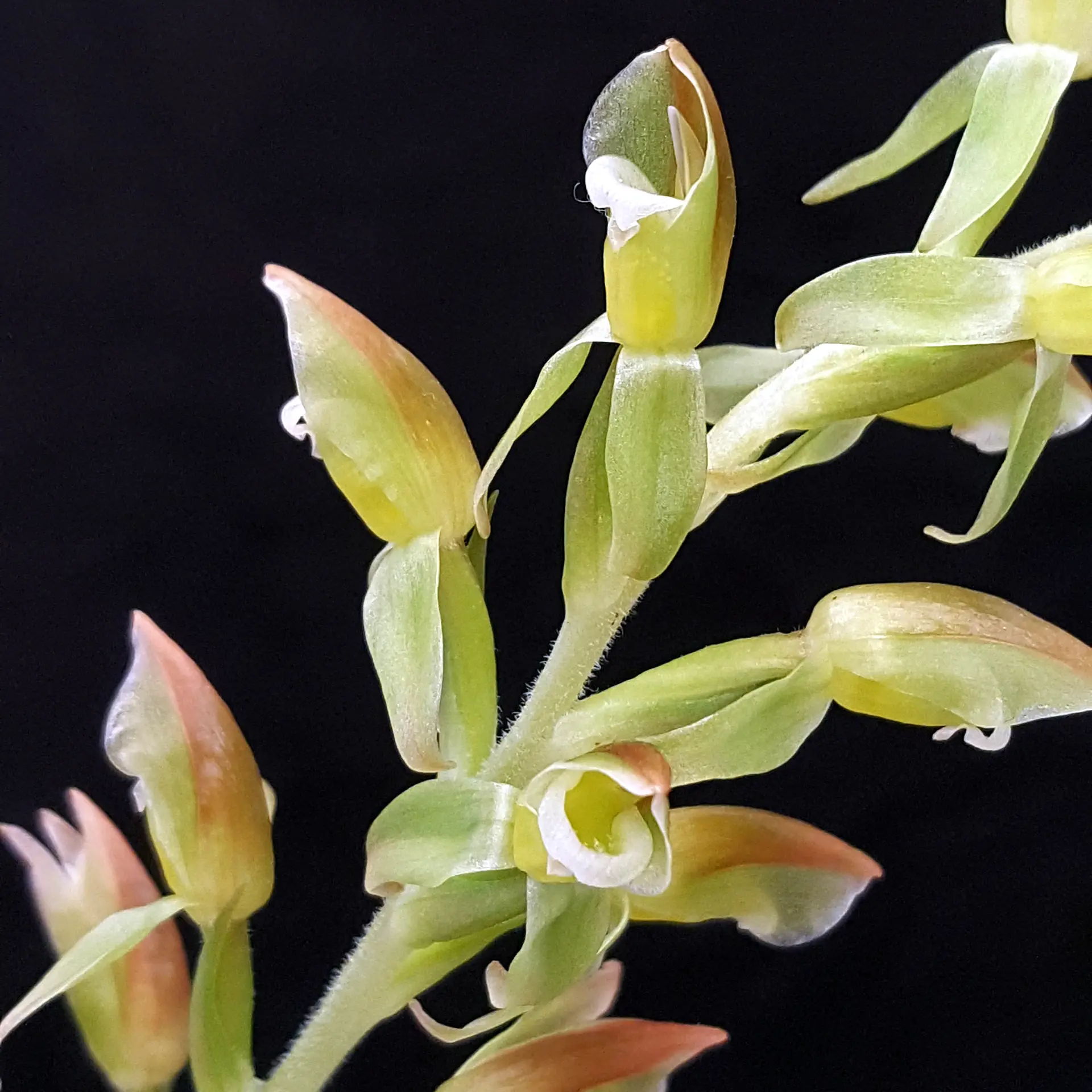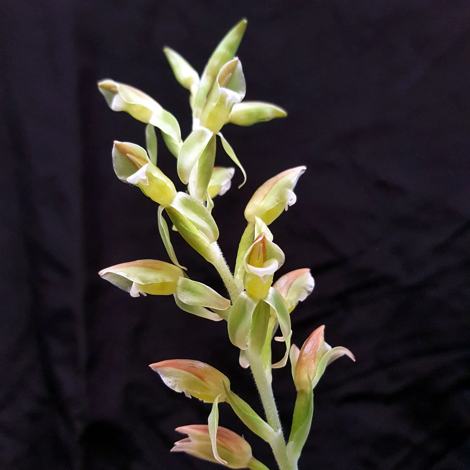 Hier nun eine Besonderheit, eine Überraschung auch für mich: Goodyera viridiflora 'Surprise'. Goodyera viridiflora 'Surprise' (Blume) Blume 1858 ist schon lange bekannt, befindet sich aber noch immer selten in Kultur, obwohl sie einfach zu halten ist. Dies zeigt sich an ihrem weiten Verbreitungsgebiet was für eine anpassungsfähige Art spricht. Bei dieser Juwelorchidee sind es vor allem die überraschend großen, ansehnlichen Blüten, die für Begeisterung sorgen. Bis zu 20 Stück finden sich an einem Blütenstand.