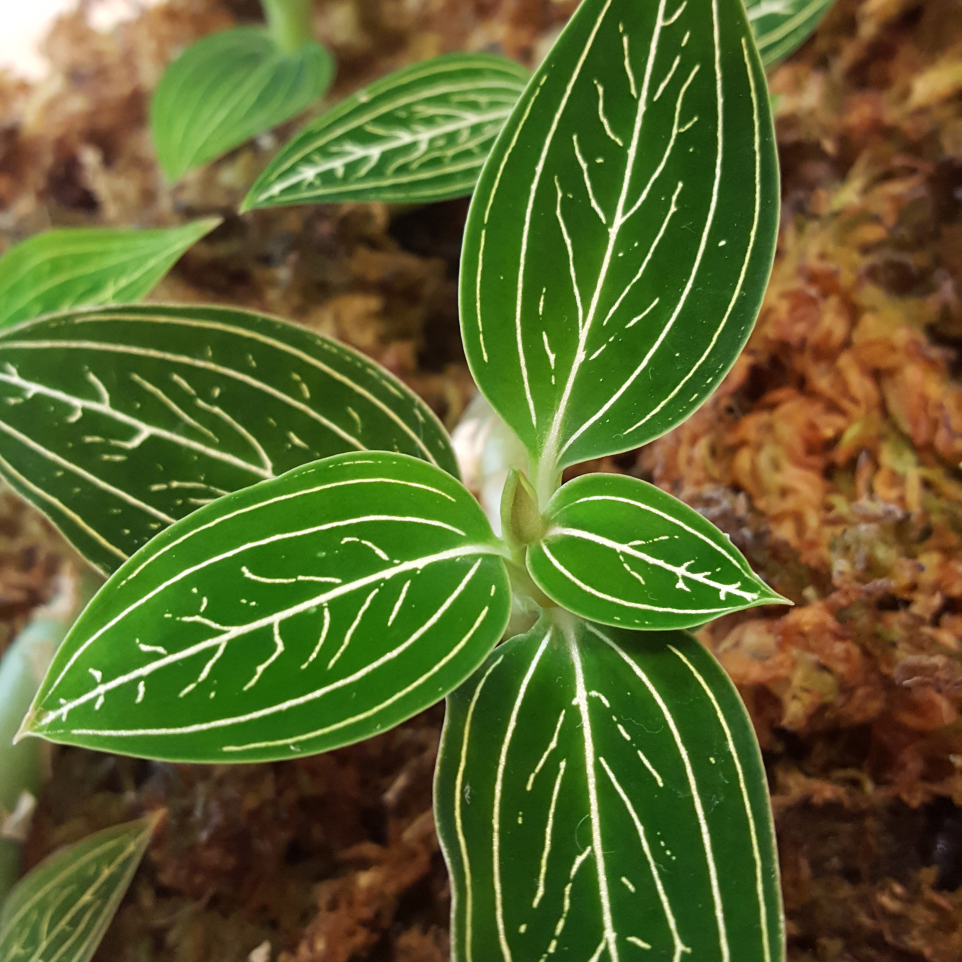 Juwelorchideen der Gattung Ludisia wurden früher unter dem Gattungsnamen Haemaria vertrieben. Lange Zeit war Ludisia discolor die einzige Art innerhalb ihrer Gattung, bis dann 2013 Ludisia ravanii als neue Art beschrieben wurde. Von Ludisia discolor (Ker Gawl.) Blume werden verschiedene Kultivare angeboten, darunter Ludisia discolor 'Silvergreen' und Ludisia discolor 'Copper Web'. Erstere betört die Betrachterin vor allem durch den schönen Kontrast der hellen Blattadern auf grünem Blattgrund. Bei Raumtemperatur gehalten kommen Ludisa-Kultivare gut zu recht, vorausgesetzt sie bekommen nicht zu viel Licht ab. Daher direkte Sonne vermeiden. Die Wurzeln sollten sich in feuchtem Substrat befinden, das aber nicht nass sein sollte. Kultivare der Gattung Ludisia gehören zu den beliebtesten Juwelorchideen. Sie erhalten eine Jungpflanze, die noch deutlich wachsen wird.