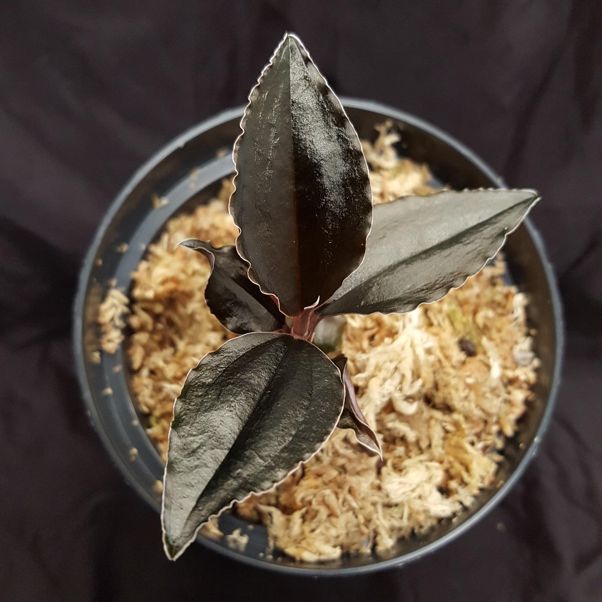 Kaum im Handel zu finden sind Juwelorchideen der Gattung Odontochilus, ich bin daher glücklich Ihnen diese Kostbarkeiten anbieten zu können. In ihrem natürlichen Umfeld gedeihen sie im Unterwuchs feuchter Wälder. Das Besondere an Odontochilus elwesii ' New Moon' C.B.Clarke ex Hook.f. 1890 sind die tief rot, nahezu schwarz gefärbten Blätter, die aufgrund ihrer schimmernd-glänzenden Oberfläche schwer zu fotografieren sind. Diese klein bleibende Juwelorchidee kommt in Vietnam, Thailand, China und Myanmar vor und ist mit Sicherheit einzigartig aufgrund ihres Erscheinungsbildes. Sie fühlt sich bei erhöhter relativer Luftfeuchtigkeit bei Raumtemperatur wohl, sollte aber keiner direkten Sonne ausgesetzt werden. Bitte das Sphagnum-Substrat stets feucht halten, aber darauf achten, dass es nicht triefend nass ist. Hier empfiehlt sich immer eine Fingerprobe zur Kontrolle.